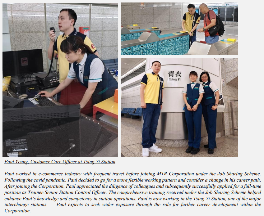 - MTR launched its Job Sharing Scheme in June 2023 so as to tackle its manpower challenges. Apart from external hires, they also welcome retirees with valid qualifications and valuable experience/job knowledge in the railway industry to join the Scheme.