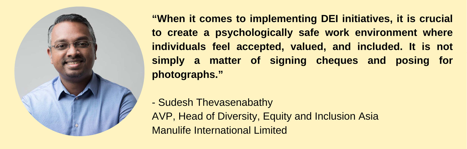 When it comes to implementing DEI initiatives, while global financial services provider Manulife has an overarching DEI strategy, the company believes that tailoring a localised approach to the needs of the jurisdictions and communities it operates in, is more effective than a one-size-fits-all approach. For example, with business activities in 11 markets across the Asia region, instead of rigidly following a formalised DEI strategy that cascades down from Manulife’s global headquarters in Toronto, Canada, Manulife has an Asia specific strategy and within this framework, strategies designed for each Asian jurisdiction. “We focus on what’s important and what really matters in each market,” explains Sudesh Thevasenabathy, AVP, Head of Diversity, Equity and Inclusion Asia, Manulife International Limited. “It’s about making sure the work environment is a psychologically safe place where people feel accepted, valued and included,” he added. This can include the way people are recruited, ensuring underrepresented employees have access to career development opportunities, recognising individual needs and differences, ensuring equitable salaries are offered and providing visibility into the organisation’s DEI policies.